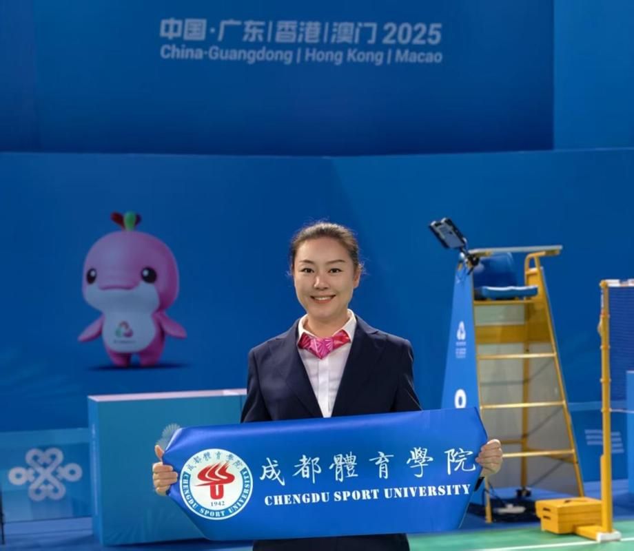在竞争尤为激烈的乒乓球赛场上,岳海鹏以严谨的态度和公正的判罚,出色完成了多项执裁任务。尤为值得一提的是,他执裁了奥运冠军樊振东的关键场次。面对顶尖运动员的高速对抗和瞬息万变的比赛节奏,岳海鹏沉着冷静,每一次判罚都精准果断,确保了比赛的公平、流畅进行,其专业表现赢得了运动员和竞赛组委会的一致好评。在羽毛球赛场上,孔明敏先后执裁了含金量极高的羽毛球团体决赛、单项决赛等多场关键对决。鉴于其在整个赛事期间的杰出贡献和良好的体育精神风貌,孔明敏被第十五届全国运动会组织委员会授予“体育道德风尚奖”,这一荣誉是对她个人,也是对我校教师队伍专业素养与师德师风的最佳肯定。