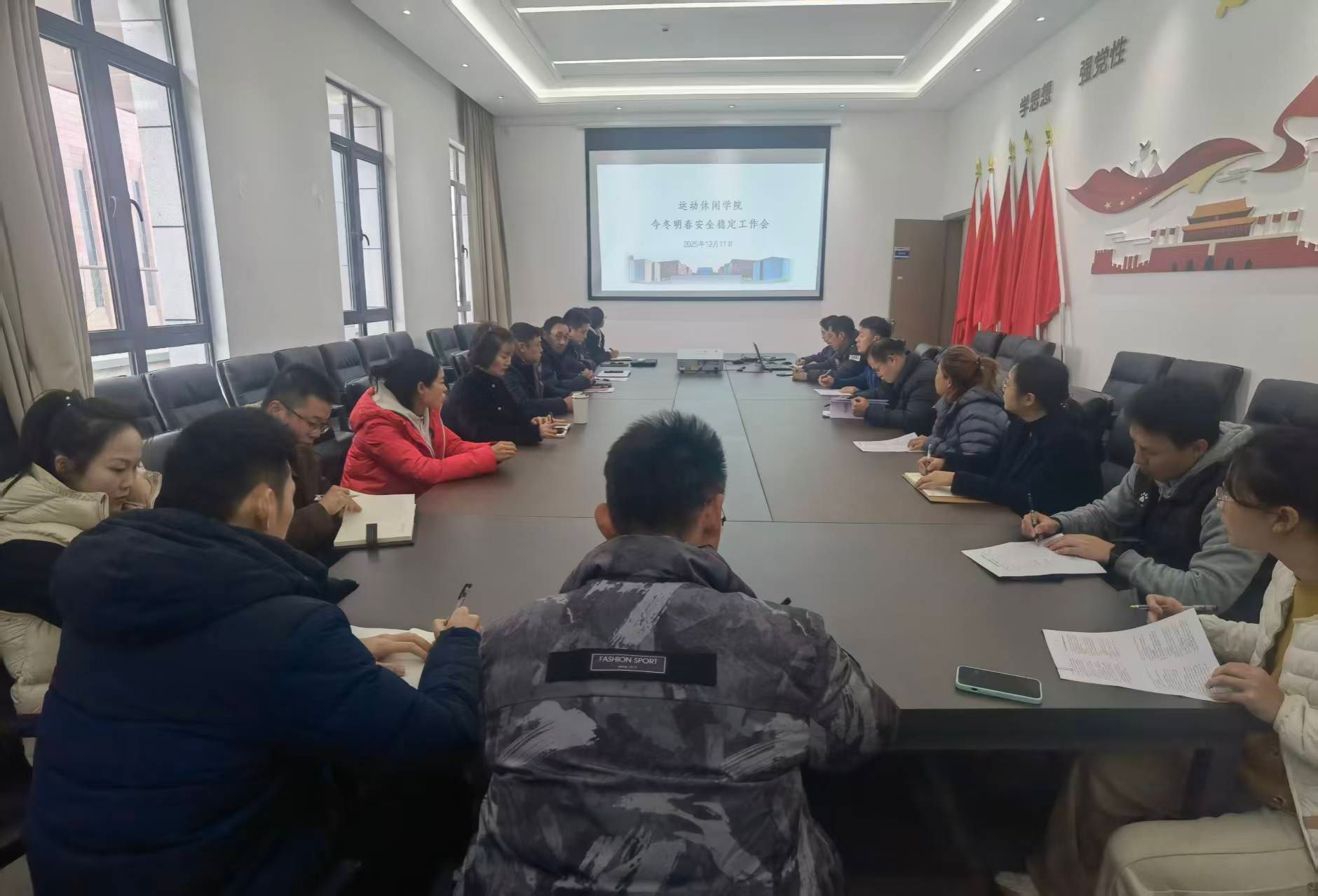 为深入贯彻落实学校安全稳定工作精神,筑牢校园安全防线,保障学院各项工作平稳有序,运动休闲学院于2025年12月11日中午召开今冬明春安全稳定工作专题会。会议由院长曾洪林主持,学院全体教职工参加。