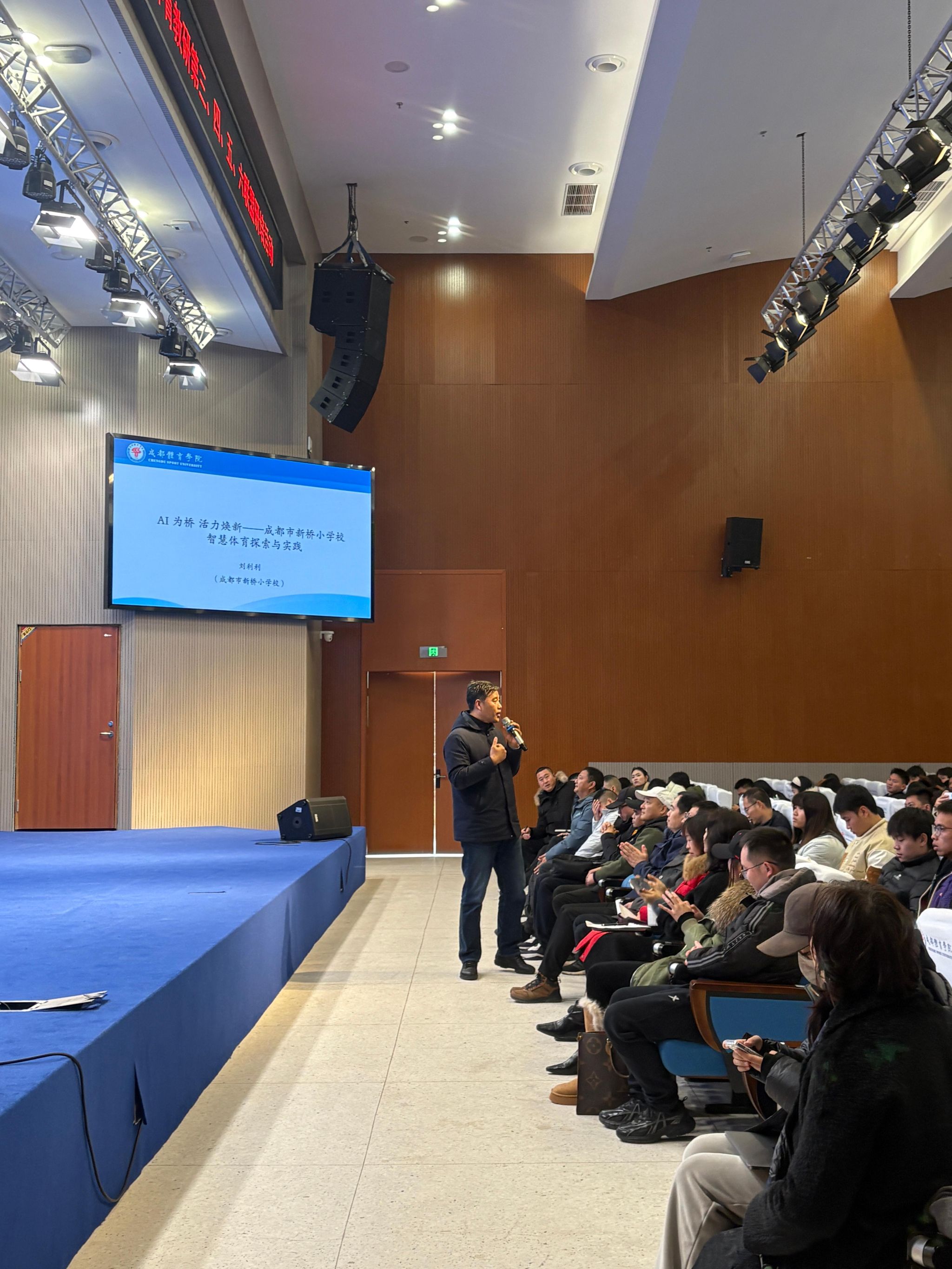 上午,与会人员参观了数智化运动表现实验室,观摩了数字跑道、敏捷训练等设备的现场演示,并就其在教学训练中的实际应用与技术人员展开交流。在智慧课程专题分享中,我院李遵教授作了题为《四美塑能:健美操智慧教学系统的构建与实践》的报告,来自四川大学附属实验小学南区学校、成都师范银都紫藤小学、成都市新桥小学校的三位一线教师吴若愚、彭商静、刘利利,分别展示了智慧体育在中小学的创新实践案例。分享结束后,教务处李明达处长与在场教师围绕智慧体育的落地路径与师资培养等议题进行了深度对话。