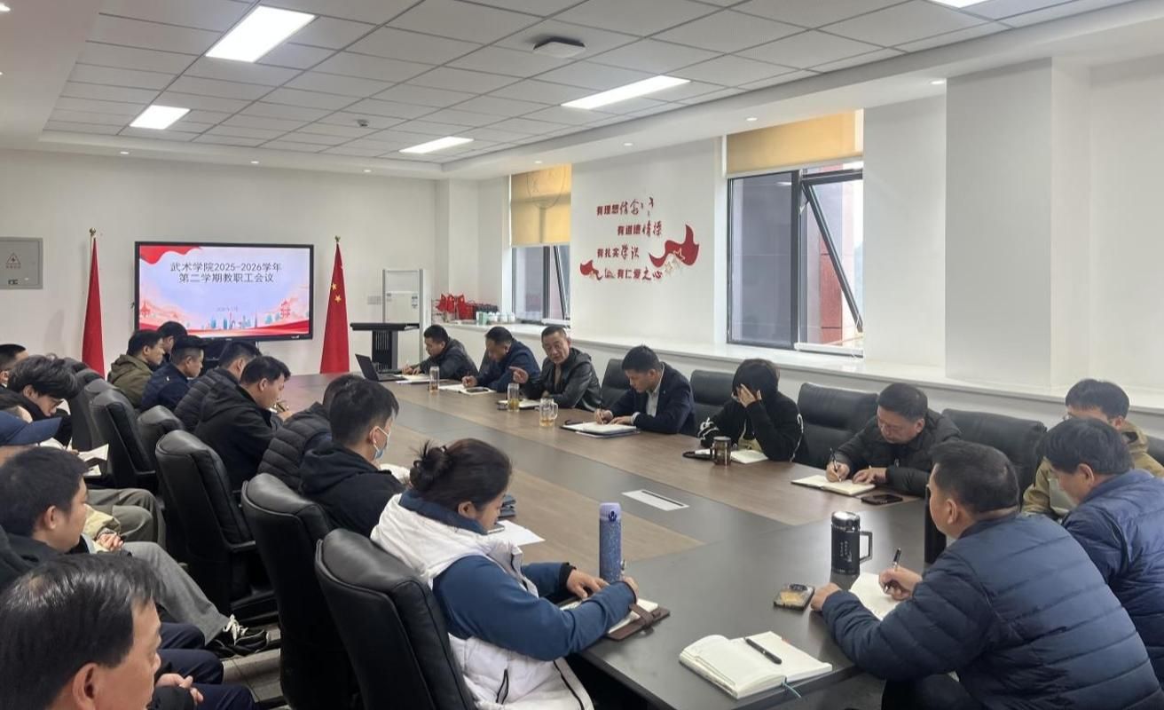 3月2日上午,武术学院在武术馆会议室召开2025-2026学年第二学期全体教职工会议,全面部署新学期各项工作。学院领导班子及全体教职工参加。会议由院党委书记罗兴山主持。