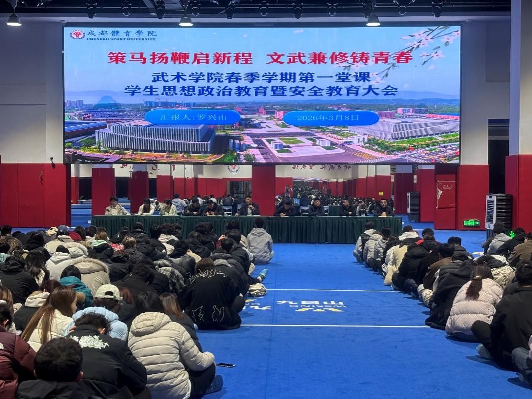 3 月 8 日,武术学院春季学期第一堂课学生思想政治教育暨安全教育大会顺利召开。学院党委书记罗兴山、全体辅导员及班主任出席,全院学生参会。会议围绕学风建设、文明素养、学生就业、安全教育等重点工作,进行全面部署与动员。