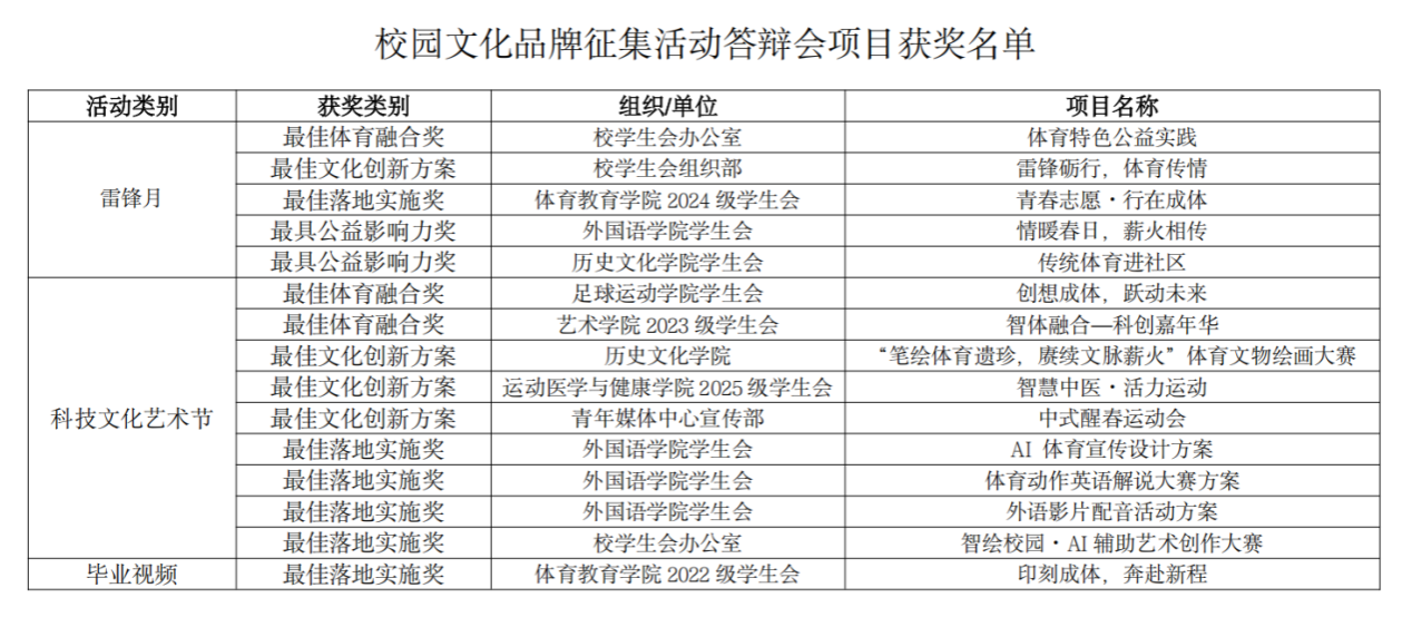 此次答辩会既是活动征集成果的集中展示,更是同学们思想交流、创意碰撞的优质平台,充分展现了成体学子昂扬向上的精神风貌。入选项目内容多元、各具特色,为校园文化品牌落地实施、提升文化育人实效注入新动能,对推动具有成体特色的校园文化体系建设具有重要作用。
