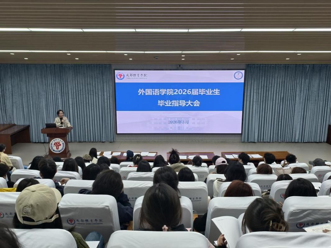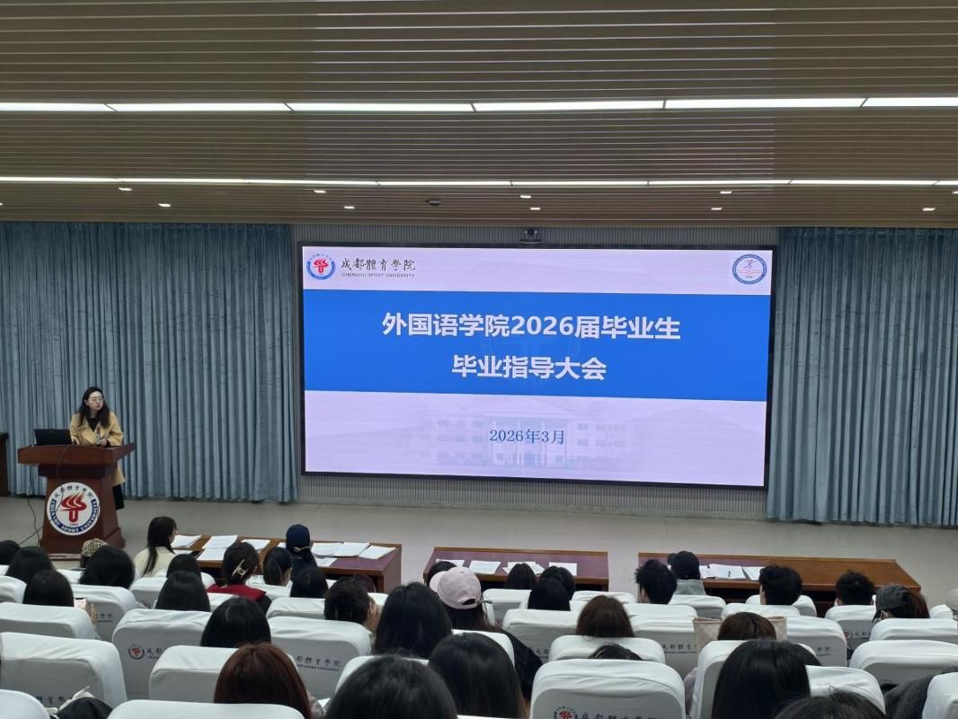 为扎实推进2026届毕业生顺利毕业,助力学生实现高质量充分就业,3月24日,外国语学院召开2026届本科生毕业指导大会。学院党委书记顾春先、专业外语教研室副主任张伟英、毕业年级辅导员樊芷吟及2026届全体本科毕业生参加会议。