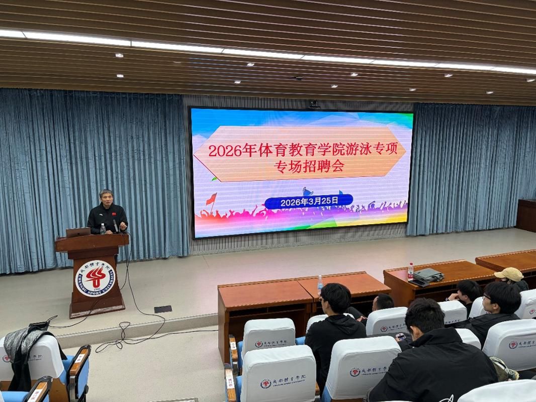 2026年3月25日,体育教育学院在100教室举办游泳对口专场招聘会。本次招聘会特邀金海豚体育产业有限公司(浙江)、成都智乐文化体育有限公司两家单位到场宣讲,吸引毕业年级研究生、本科生30余名及非毕业年级学生60余名参与。招聘会由游泳教研室主任蒋徐万主持。