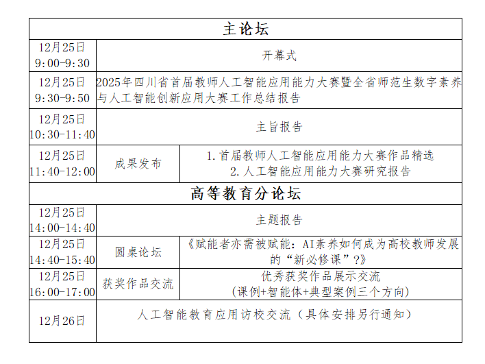 由四川省教育厅指导的《首届教师人工智能创新应用能力大赛成果交流暨教师数字素养提升论坛》将于12月25日-26日在成都师范学院举办。为提升我校教师数字素养与人工智能应用能力,促进智慧课程建设与教育教学改革,积极准备四川省第二届教师人工智能创新应用能力大赛,学校决定组织相关人员参加本次论坛(主论坛及高等教育分论坛)。现将有关事项通知如下: