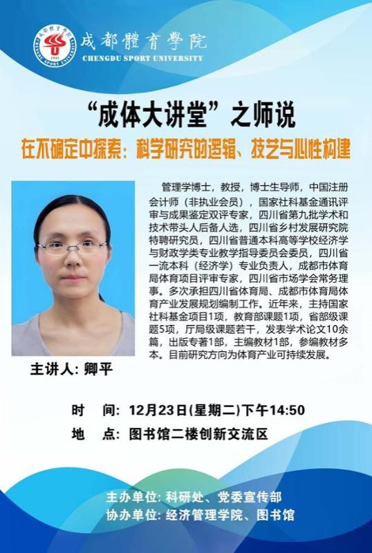 学校将于2025年12月23日(周二)下午14:50在图书馆2楼创新交流区举行“成体大讲堂”科研讲座系列活动之师说。本次讲座特邀经济管理学院卿平教授主讲。题目为:《在不确定中探索:科学研究的逻辑、技艺与心性构建》。欢迎全校师生积极参加。
