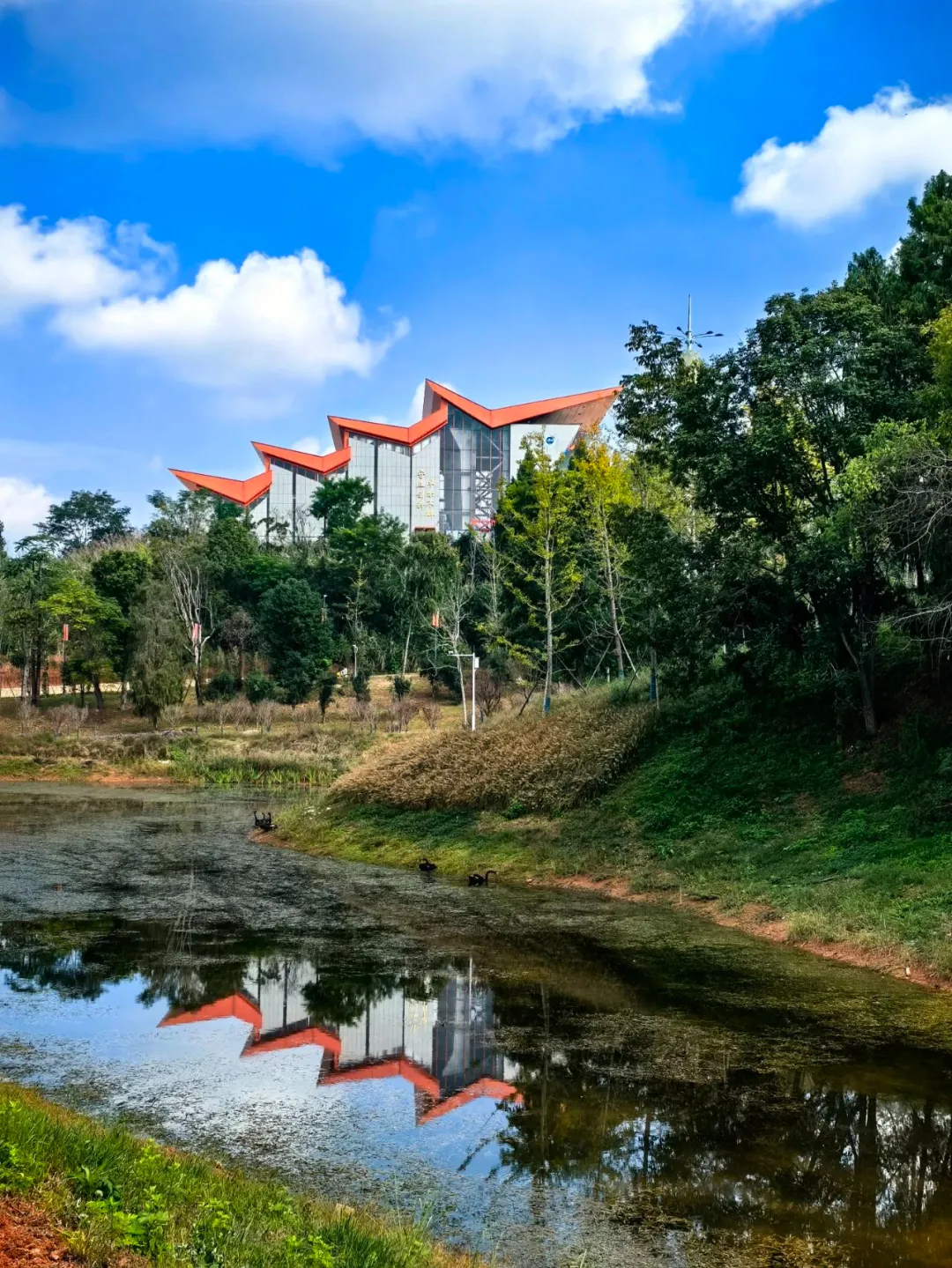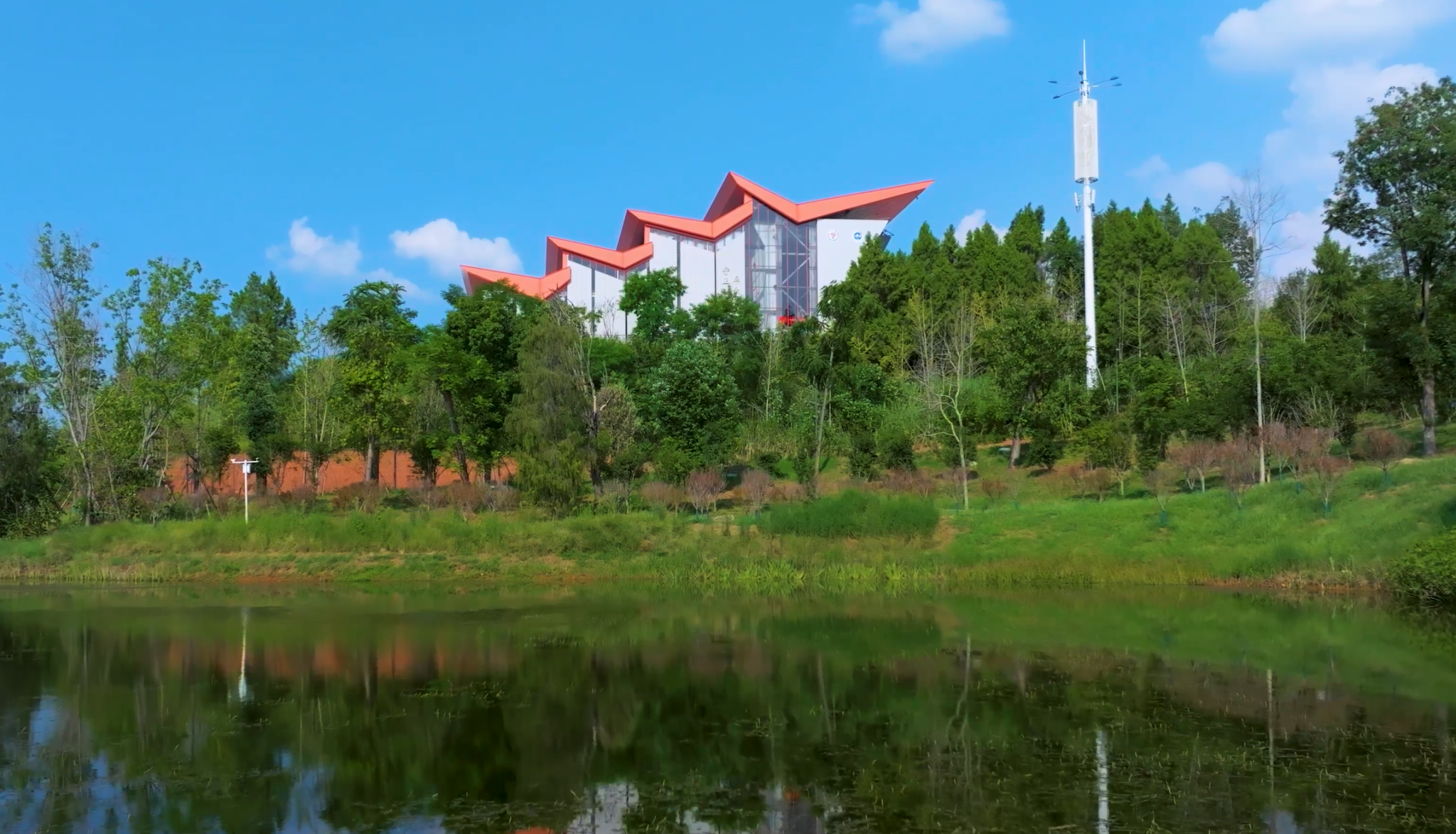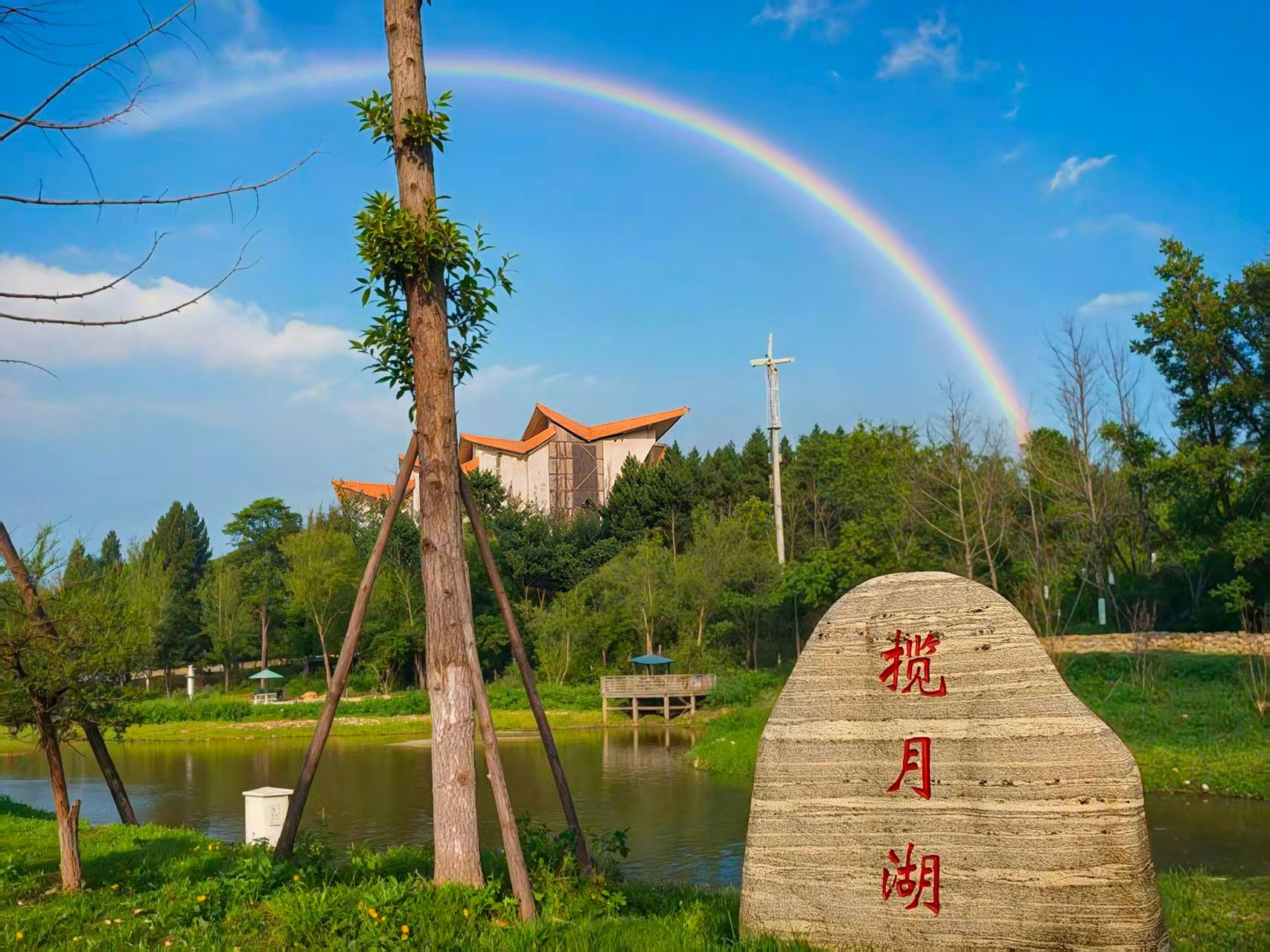 揽月湖:虎丘和办公楼之间的湖泊依山就势,水深面阔,天光云影,俱在其中。据毛泽东“可上九天揽月,可下五 洋捉鳖”词意,取名“揽月湖”。