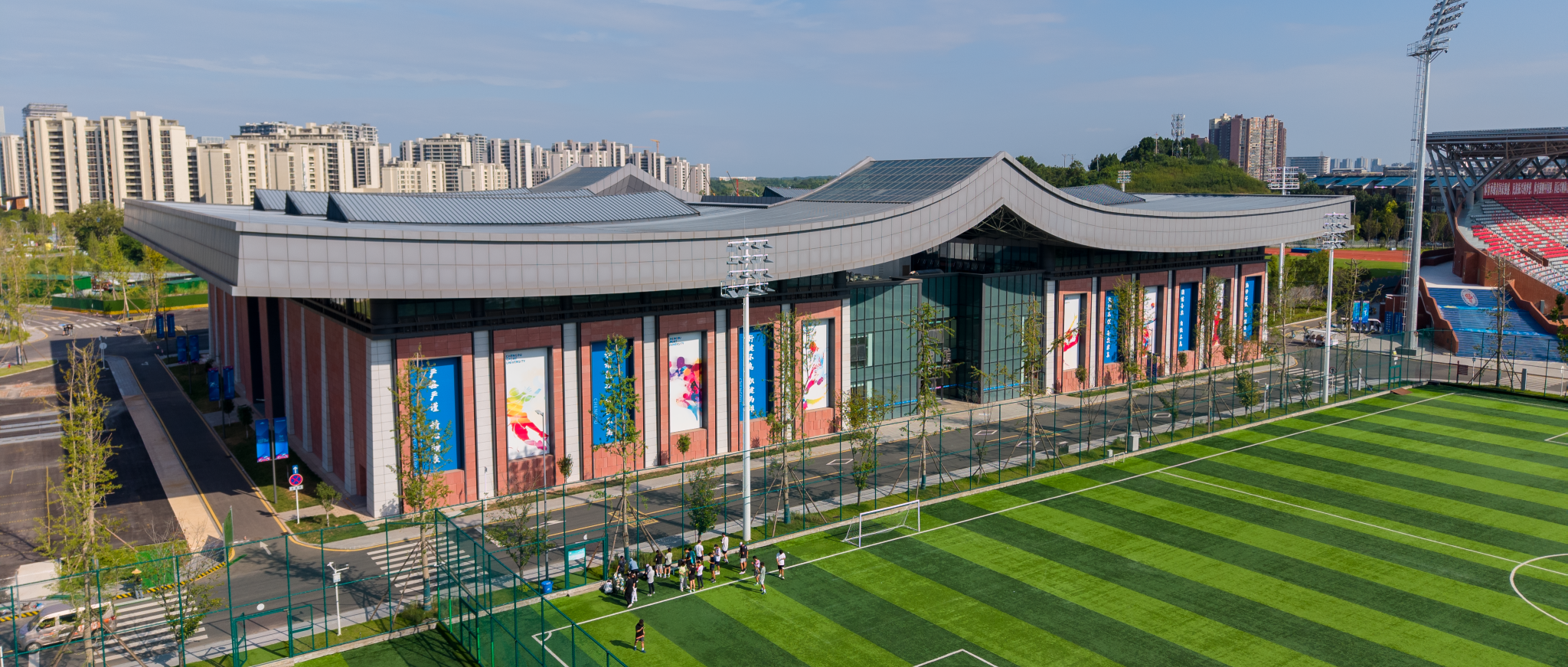 网球馆:建筑面积为10813.44平方米,地上两层,建筑高度22.21米,框架结构。设99.44平方米会议室1个,室内网球场8片,配套贵宾休息室,可作为大型赛事训练热身场地。教学训练之余,可作为全民健身网球或其他室内活动举办场地。