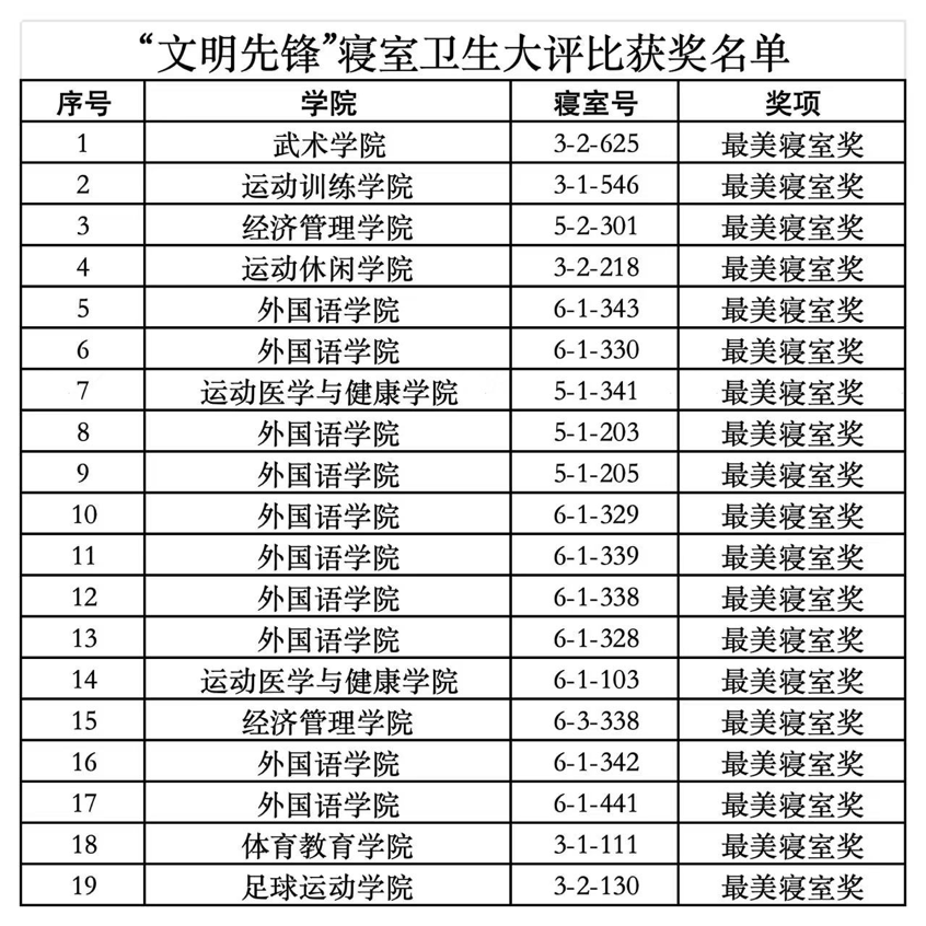 活动覆盖全校学生寝室,参与率超过60%,累计收到近300间寝室的打卡材料。经学院自查、材料报送和校级评审等环节,最终评选出19个“最美寝室奖”,经济管理学院、外国语学院、运动医学与健康学院获“最佳组织奖”。