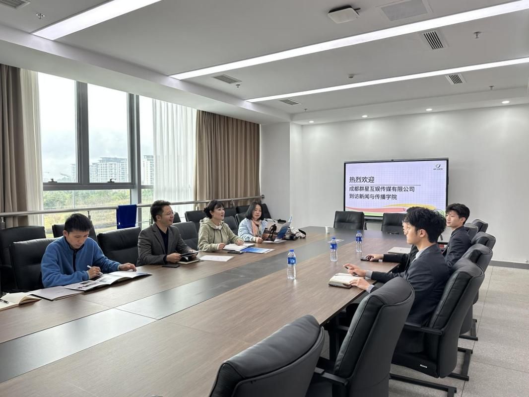 10月24日下午,成都群星互娱传媒有限公司总经理彭科翔一行三人到访新闻与传播学院,进行校企合作座谈。学院党委副书记冯瑞、副院长张小林等5人参加了此次座谈。