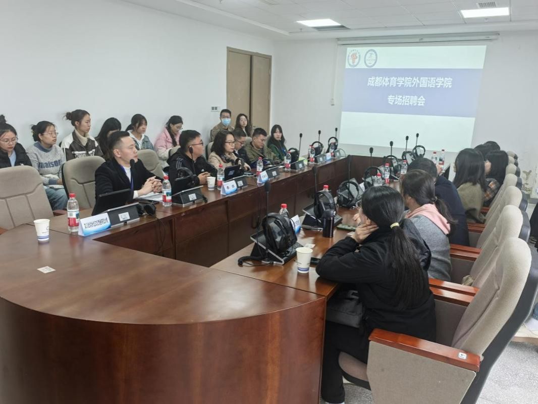 为切实拓宽就业渠道、搭建优质就业桥梁,11月7日中午,外国语学院在球类馆609会议室召开2026届毕业生专场招聘会。本次招聘会邀请到了成都优译信息技术股份有限公司、四川绘读会说文化传播有限公司、成都启程新贸国际贸易有限公司、四川联龙教育科技有限公司、成都欧诺体育文化传播有限公司共5家单位。